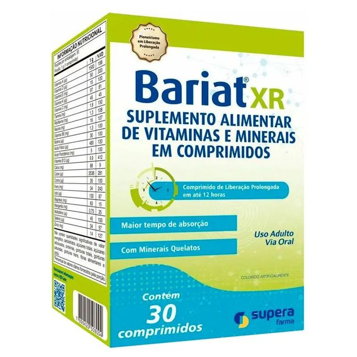 Bariat XR Supera Farma, em sua caixa com 30 comprimidos, é um polivitamínico completo desenvolvido para atender às necessidades nutricionais específicas de pessoas que passaram por cirurgia bariátrica. Ele serve como o suporte ideal para a recuperação, ajudando a prevenir deficiências e garantindo que o corpo receba os nutrientes essenciais, sendo considerado a melhor vitamina pós bariátrica para muitos.