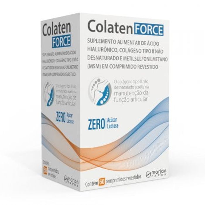 Colaten Force 60 Comprimidos Revestidos é um suplemento alimentar completo da Marjan Farma, desenvolvido para promover a saúde e bem-estar de articulações, pele e cabelos. Sua fórmula avançada, rica em colágeno, ácido hialurônico e MSM, auxilia na manutenção da função articular, melhora a mobilidade e a hidratação da pele, contribuindo para uma aparência mais jovem e saudável.