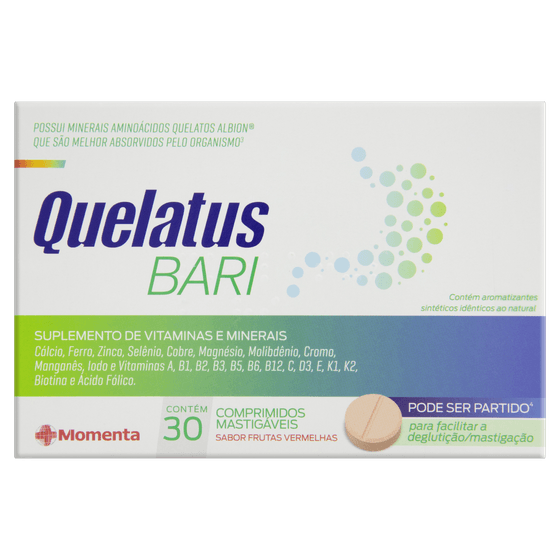 Quelatus Bari possui uma composição rica em vitaminas como A, C, D3, E, K12, e Complexo B, além de minerais como Cálcio, Ferro, Zinco, Selênio, Magnésio, Cromo e Iodo. Essa combinação visa um suporte nutricional completo para o organismo.